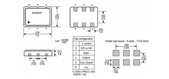 Bomar晶振,B1825-BACS3T6N-20.000000晶振,7050mm貼片晶振